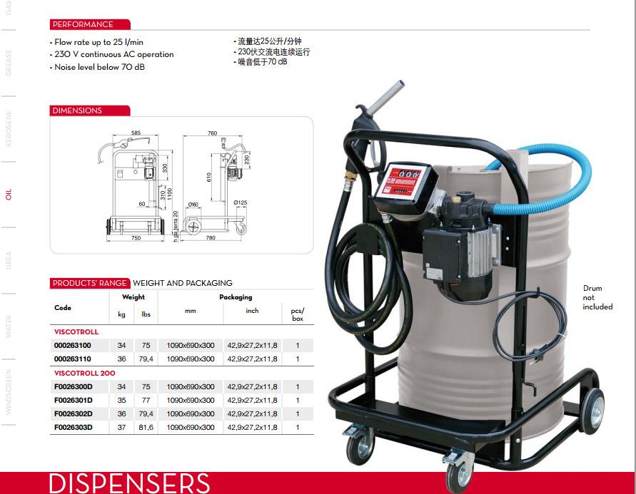 防腐蝕的橡膠油管,配置移動式推車,推車上可放置油桶,適應性強,使用方便。