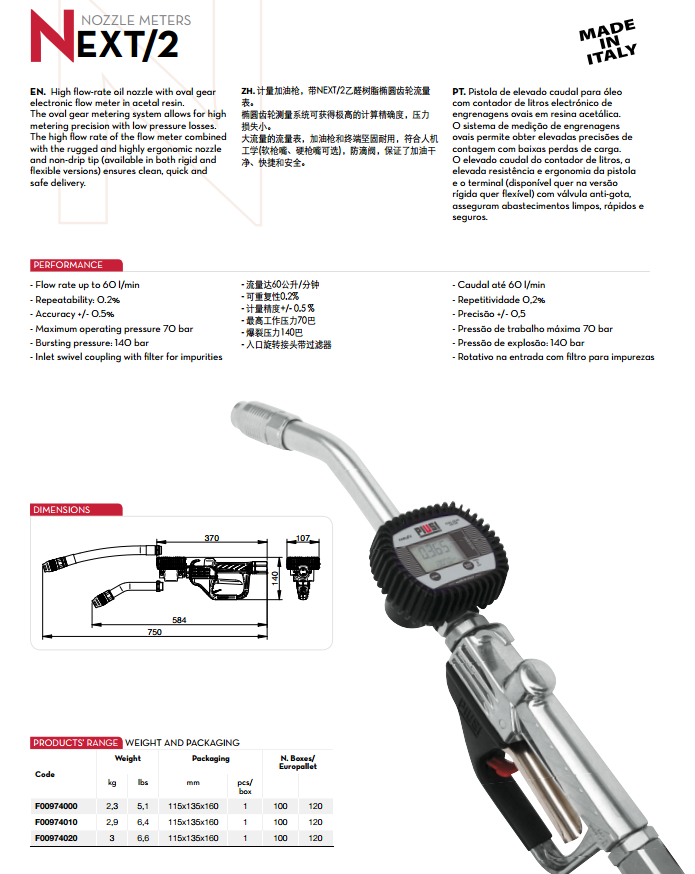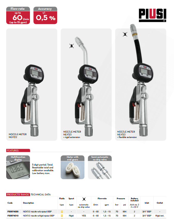 詳細說明: NEXT/2 nozzle 計量加油槍,帶NEXT/2乙醛樹脂橢圓齒輪流量表。 橢圓齒輪測量系統可獲得極高的計算精確度, 壓力損失小。 大流量的流量表, 加油槍和終端堅固耐用, 符合人